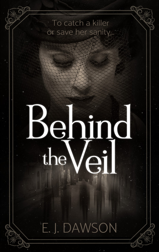Text; “An old fashioned ghost story told with inventiveness and style.” Kirkus Reviews. Behind the Veil, out October 1 2021, ejdawson.dom, background image a hand and vague shape of a face.