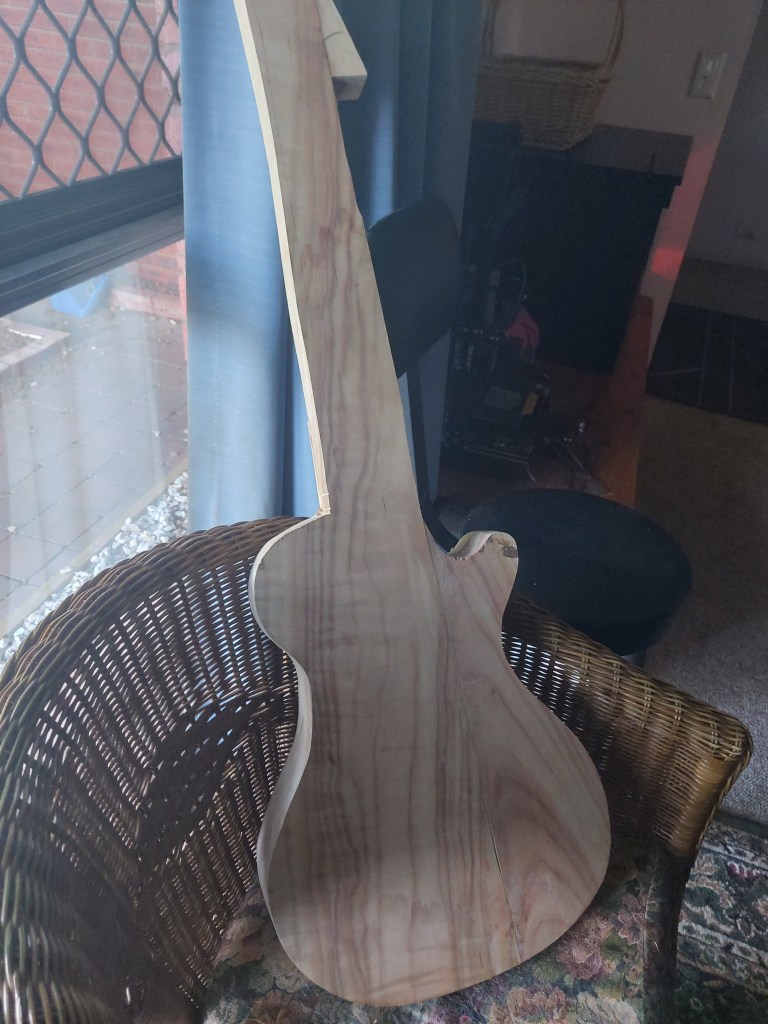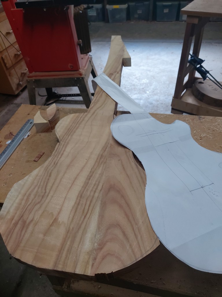 He’s been a guitar player for years, had made one of his guitars, and wanted to make another. My Dad has a very good workshop and so they decided to make one together. I watched my husband draw the outline over the top of my battered Terry Pratchett, and tried to ignore the bandsaw, but duly went down to breathe in the smell of camphor laurel and admire the work. And staring down at the block of wood, in a kind of guitar shape, it occurred to me, that this was a first draft.