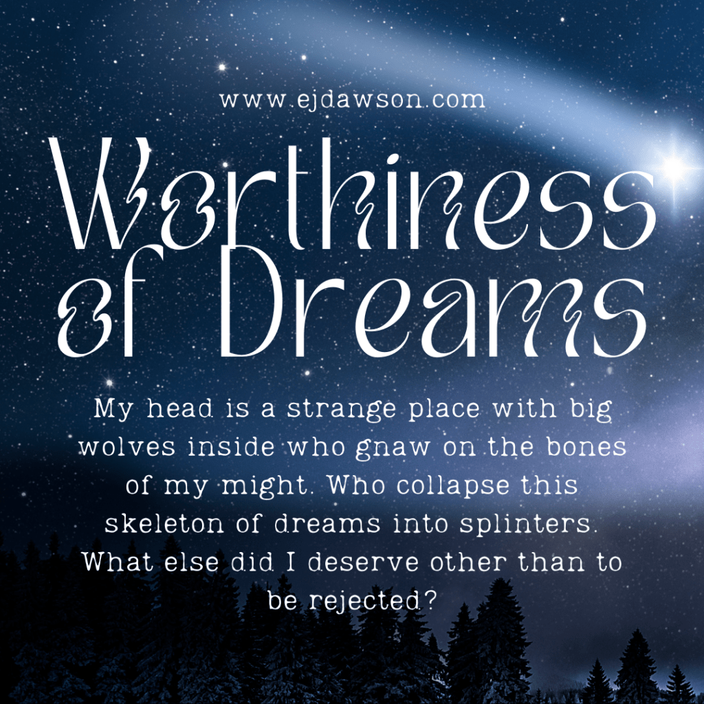 My head is a strange place with big wolves inside who gnaw on the bones of my might. Who collapse this skeleton of dreams into splinters. What else did I deserve other than to be rejected?