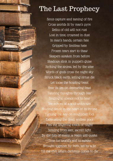 The Last Prophecy series came to me as I started to write a book about a navigator aboard an airship. As I began writing, I saw, in the villain’s eyes, that there was far more to this story than just this facet.